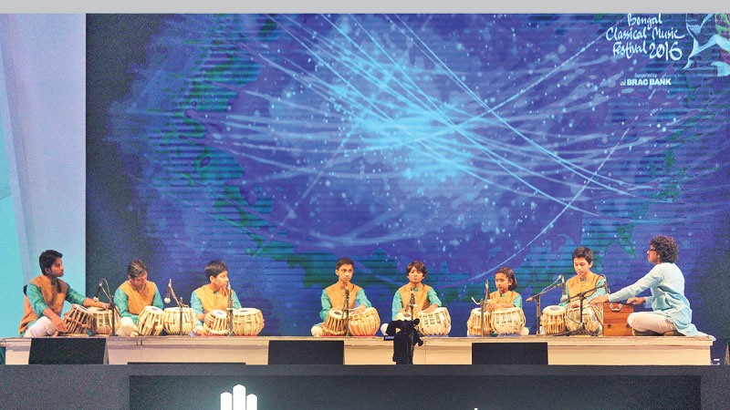 Students of Bengal Parampara Sangeetalaya, Dhaka perform with tabla at Bengal Classical Music Festival in the capital yesterday. Independent photo